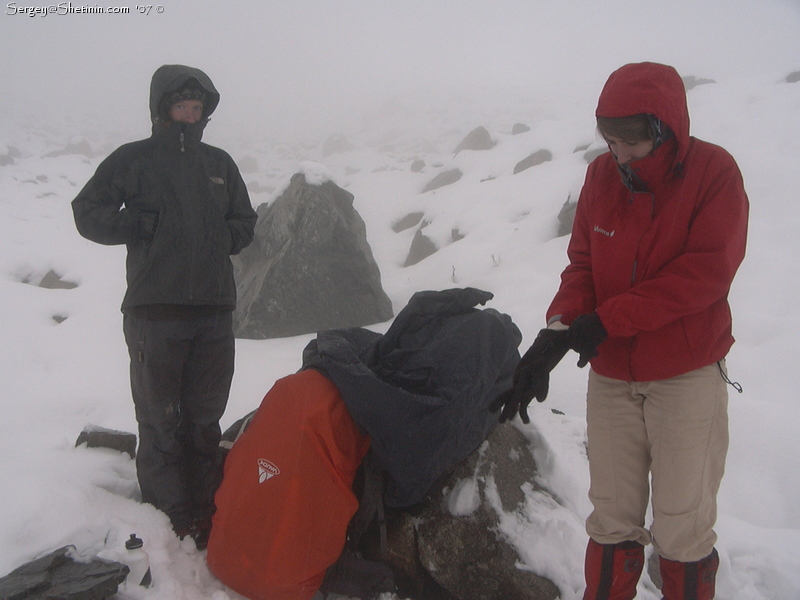 Достигнув места, откуда можно было увидеть конечную точку нашего сегодняшнего подъема (перевал Теримтор 4000м), мы остановились чтобы немного отдохнуть и подождать отставших товарищей, тем более нас накрыл сильный туман и пошел снежок. На фото: Кристина слева, Валери справа.