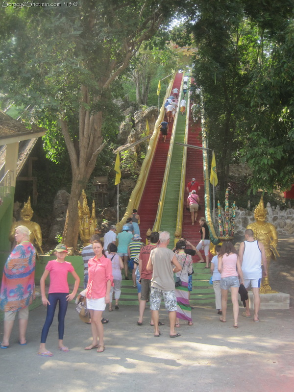 | После плавучего рынка заехали в Храм Тигра, где интересная архитектура и тело забальзамированного монаха, основателя. Вначале нам сказали подняться вверх по ступенькам и посчитать их. В конце прогулки нам скажут сколько ступенек, и кто посчитает прав - у того карма хорошая. Остальным же придется ее чистить. Мы с Любой сбились на 1 ступеньку, а Жанна была чистейшей кармы человек! 158 ступенек |